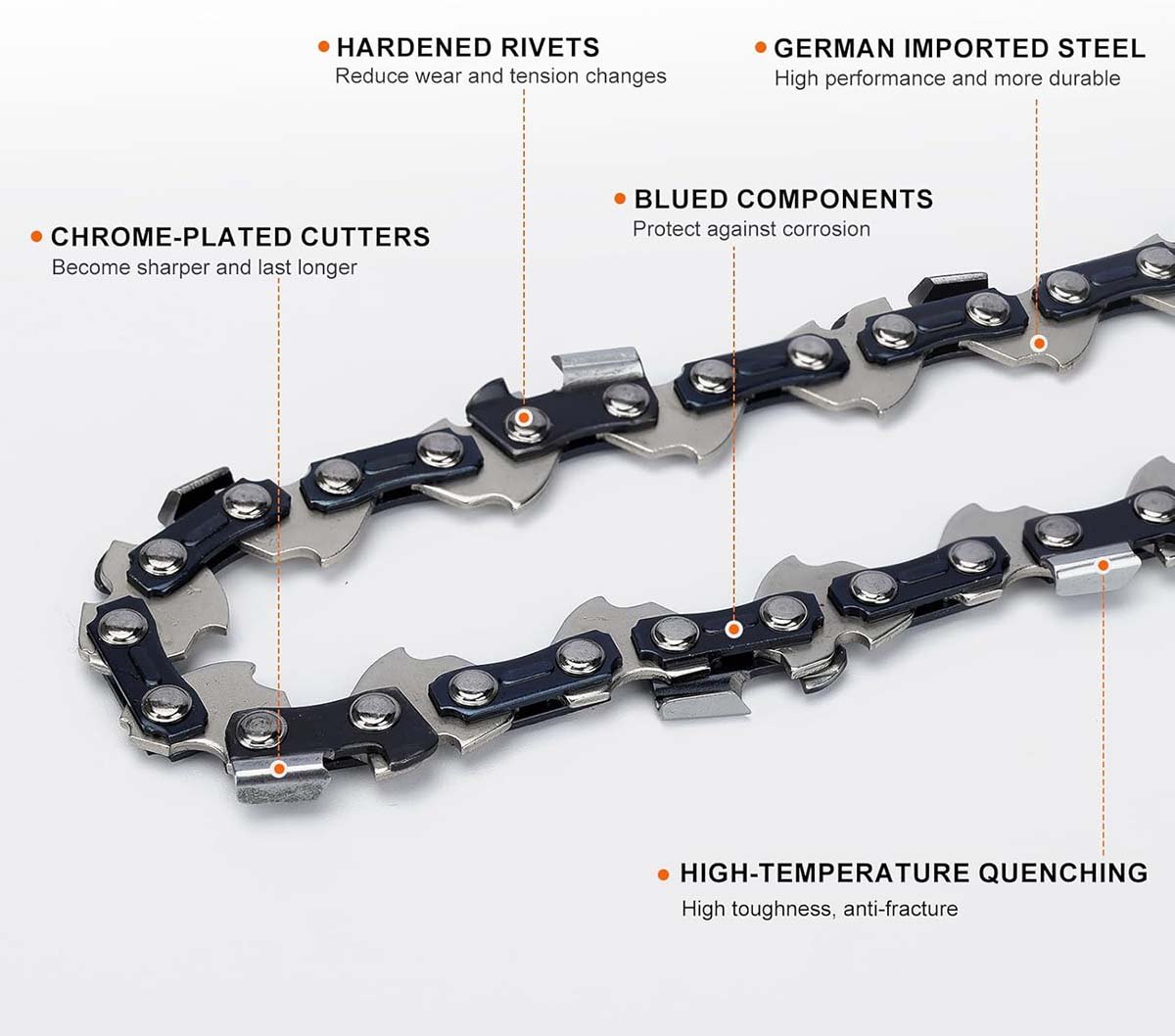 Hardened Rivets – Quality-made rivets are more wear-resisting and stronger in connection, enabling you to cut through piles of wood without tightening the chain.