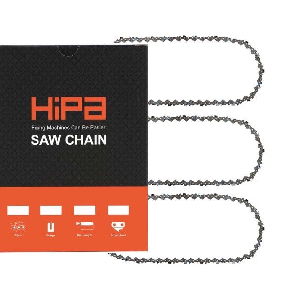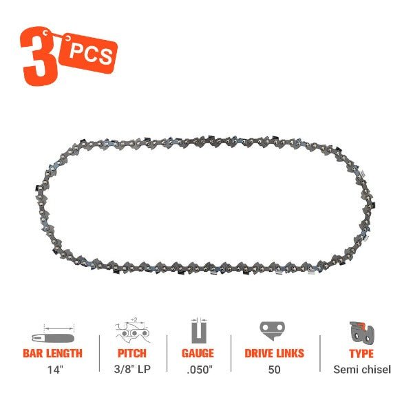 Chain Details: 3/8″ LP Pitch .050″ Gauge 50 Drive Links 14 inch Bar Length Chain, with Semi Chisel Cutter Type, Chain Sequence: Low-kickback. Sharpening with 5/32″(4.0mm) Round File. Hipa Saw Chain Code: E3-LS1-50.