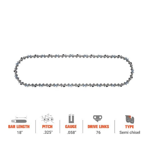 ● 325″ Pitch .058″ Gauge 76 Drive Links 20 Inch bar length standard chain. One Important Note: The chain bar length is subject to 20 inches, not 18 inches as stated on the packaging bag.