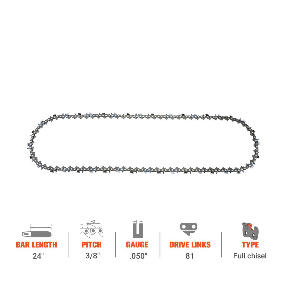 ● 3/8″ Pitch, .050″ Gauge, 81 Drive Links, 24 Inch Bar Length.